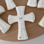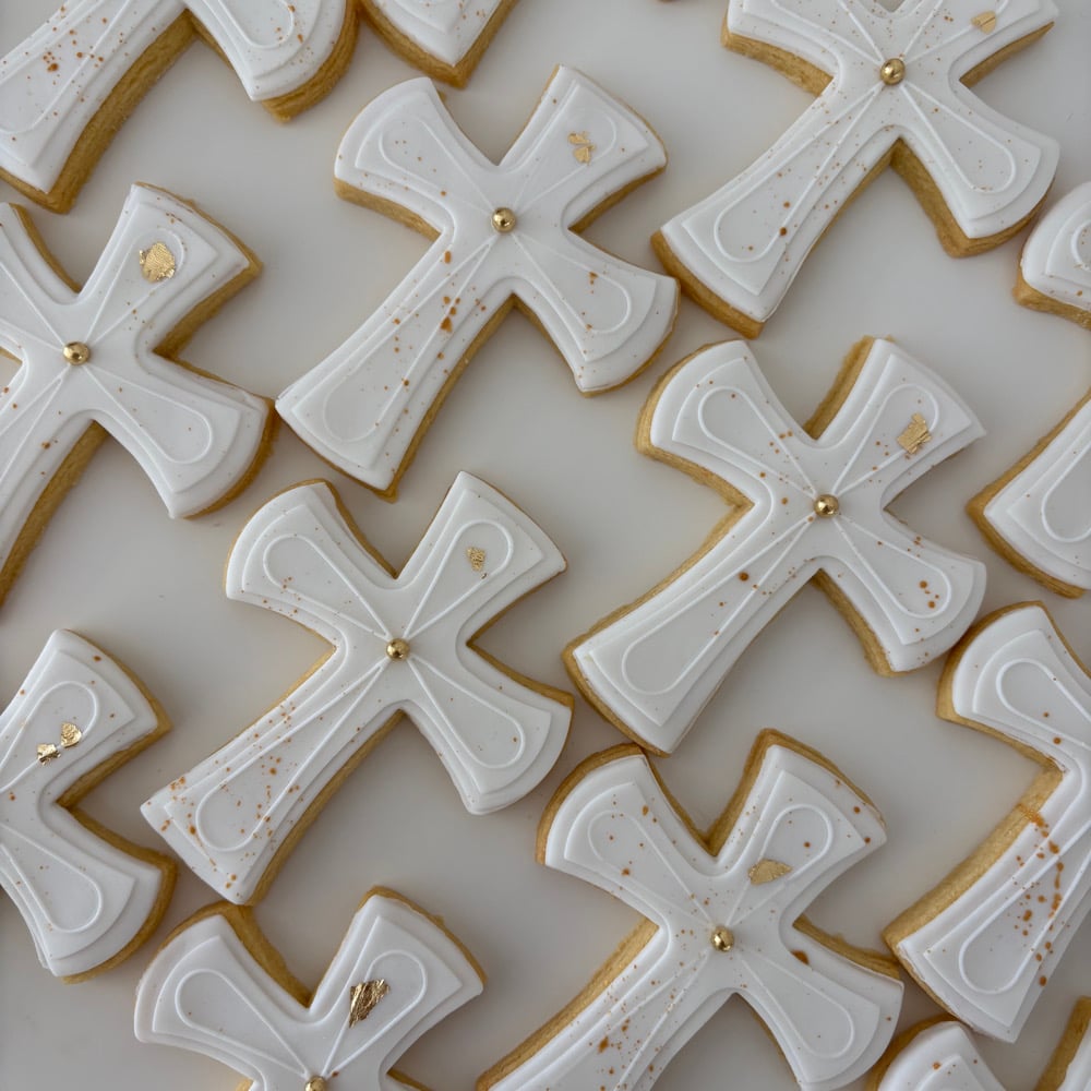 12x detailed Holy Cross cookies with white icing + Gold or Silver decorations